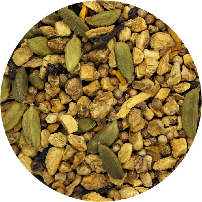 Ingredients: Ginger root, cardamom, coriander, turmeric root, cloves, nutmeg.
