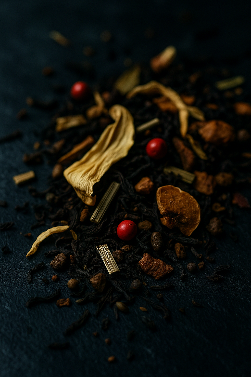 Ingredients: Black tea, ginger root, orange peel, apple, lemongrass, cinnamon, coconut, natural and artificial flavor, rose, pepper, cardamom, sunflower, red currant CONTAINS: TREE NUT (COCONUT).