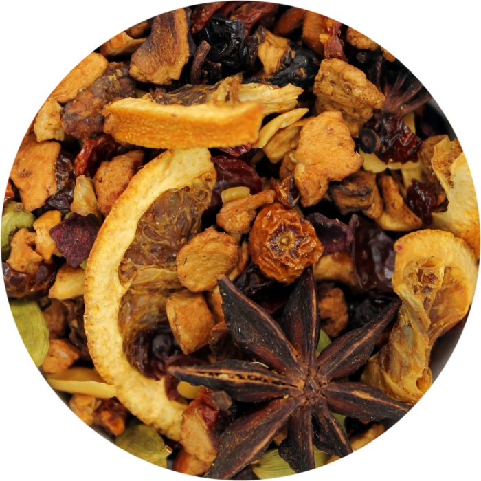 Ingredients: Apple pieces, rose hip peel, almonds, whole star aniseed, orange, artificial flavoring, whole cardamom, beetroot. CONTAINS: TREENUT (ALMOND).