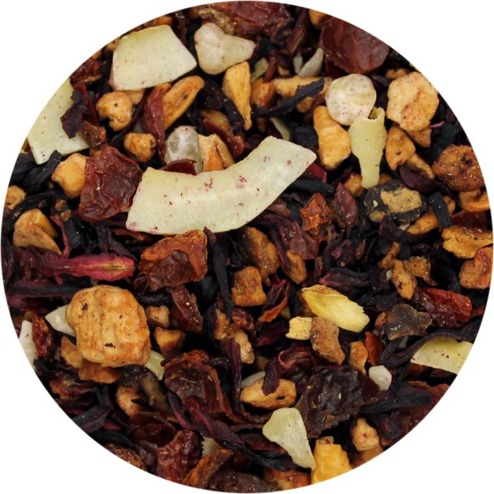 Flavor Profile A harmonious fusion of sweet pineapple and coconut, balanced by the tartness of hibiscus and rosehips, creating a refreshing and exotic taste experience.