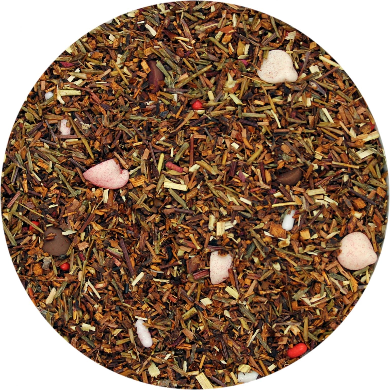 Ingredients: Red rooibos, honeybush, green rooibos, flavor, red sprinkles (sugar, corn starch, vegetable oil (palm, palm kernel), red 40 lake, dextrin, soy lecithin, confectioner’s glaze, yellow 6 lake, natural and artificial Flavor, carnuaba wax), white sprinkle (sugar, corn starch, vegetable oil (palm kernel oil and/or palm oil), soy lecithin, dextrin, confectioner’s glaze, natural and artificial flavor, carnauba wax), chocolate bits (sugar, chocolate liquor, cocoa butter, soy lecithin (an emulsifier), and vanilla), white chocolate drops (sugar, nonfat milk powder, hydrogenated palm kernel oil, soy lecithin added as an emulsifier, monoglycerides, artificial color (titanium dioxide), and artificial flavor), beet powder CONTAINS: MILK (NONFAT MILK POWDER) AND SOY (SOY LECITHIN).